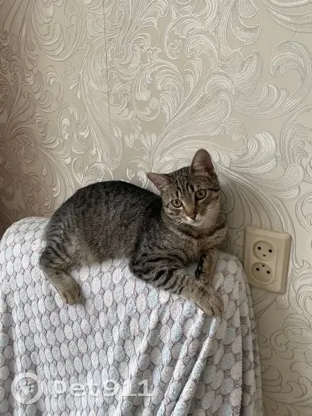 Серый, кастрированный кот, небольшой по размеру, 1,5 года, пугливый к чужим, кличка - Кузя, выпал с окна