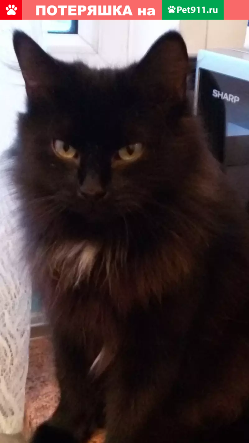 Потерялась кошка в районе дома №54 по улице Добровольцев Красносельского района г. СПб, кошка черного цвета в меру пушистая с очень пушистым хвостом, на грудке и пузике белое пятно, зовут кошку-Нюша. Возраст 4 года. Предположительно выпала с балкона второго этажа.