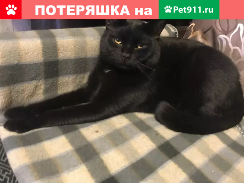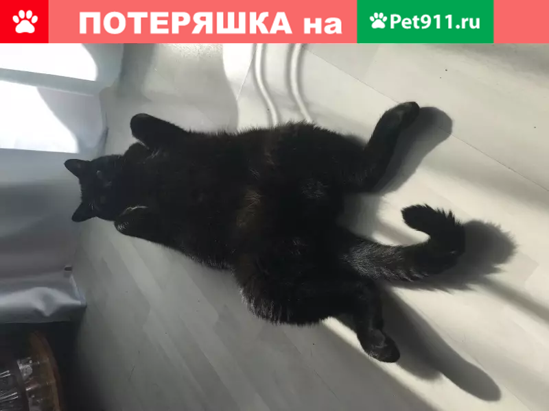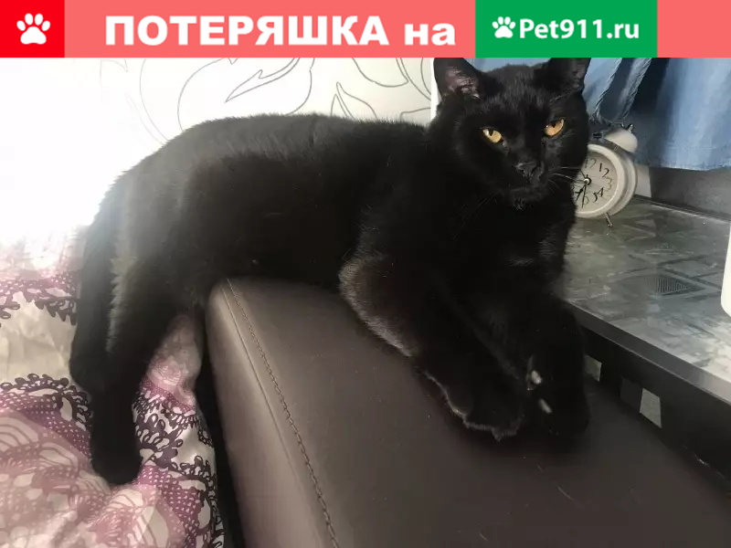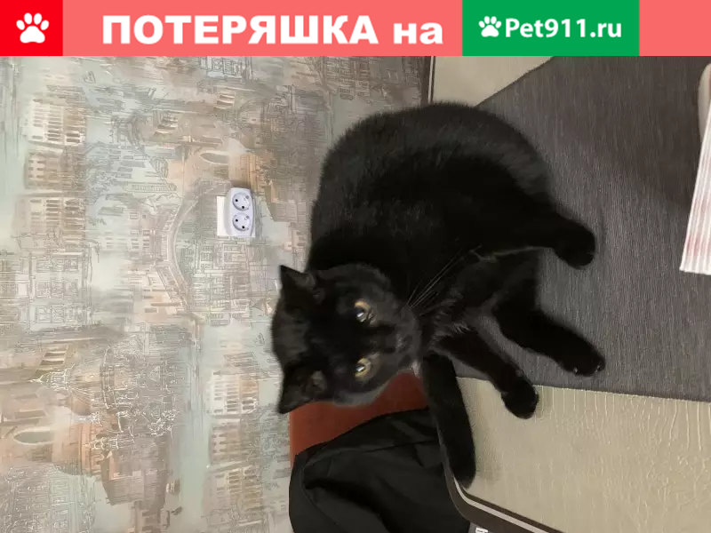 Кличка «Кактус» упал из окна.испугался строительных звуков во дворе и убежал . Помесь британца и обычного кота. Весь чёрный.На грудке маленький белый клочок волос. Боится громких звуков.