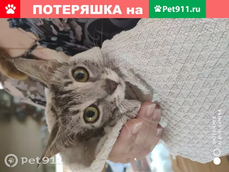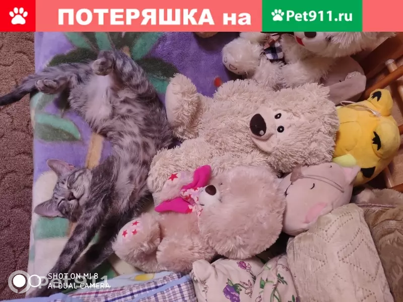 Пропала молодая кошечка. Возраст около 6 месяцев. Кличка - Дыма. Окрас серый в полоску. На ушках почти незаметные кончики. Особенность - на левой задней лапе шерсти немного меньше, чем на другой задней лапе (небольшое облысение на фоне аллергии). Плохой иммунитет. На глазах может появиться гной, если простудится. Игровая, любит приносить игрушку в зубах, чтобы ей бросали. Не очень любит, когда гладят, уходит.