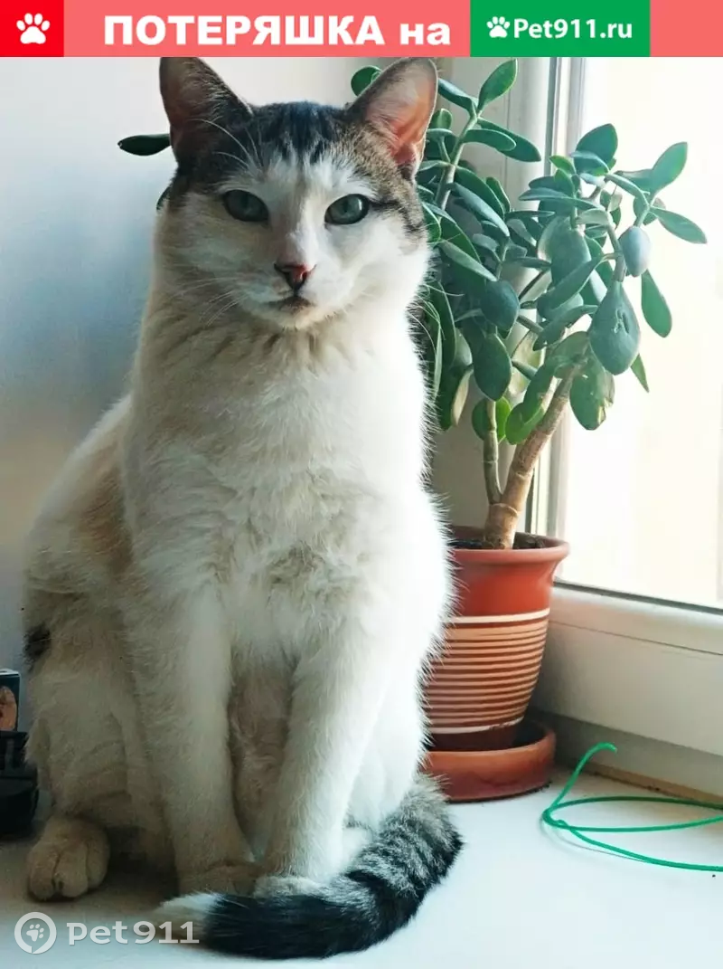 Кот, Окрас: белый с серыми пятнами, кончик хвоста белый. Крупный. Может отзываться на "Мурзик", с незнакомыми проявляет осторожность