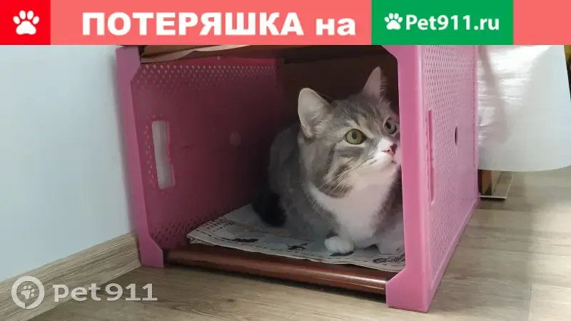 кот серый пушистый полосатый с белой грудью и шеей, белая половина носа, белые носочки. глаза светло-зеленые. кончик хвоста темный. кастрирован, коту 8 лет. Выпрыгнул из окна 3го этажа за птичкой.