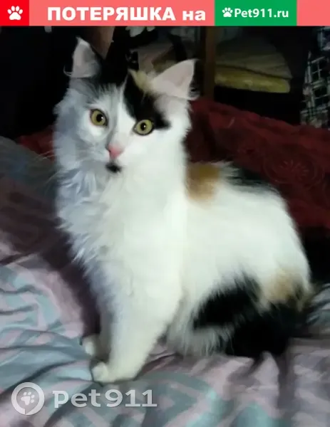 Пропала молодая кошка, возраст 6 мес. Маленькая, окрас белый с черными и рыжими участками. Хвост темный. На подбородке черное пятно, на голове черная "челка". Пугливая, на контакт с чужими может не пойти, тк находилась на приручении, вывезена с дачи для спасения и пристройства. Вероятно, случайно выскочила на лестницу, когда возвращались домой, и не сразу заметили ее отсутствие, тк днем она обычно спит. Кошка ни разу не была на улице в городе, просьба сразу сообщить, если увидите или найдете ее