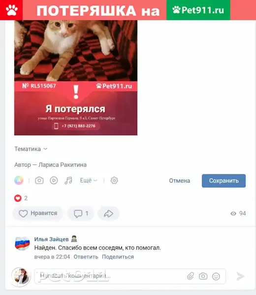 Пропал кот. 2.04 выбежал из квартиры Партизана Германа д. 9 корп. 3 парадная 1. Кот молодой ( 1 год), откликается на Гришу. Нуждается в постоянном лечении глаз. Нашедшему просьба вернуть котейку домой (вознаграждение гарантируется). Ребёнок очень грустит без своего четверолапого друга
