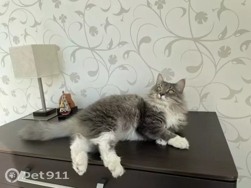 Окрас дымчато-серый, белая грудь, живот и лапы. Чипирован.