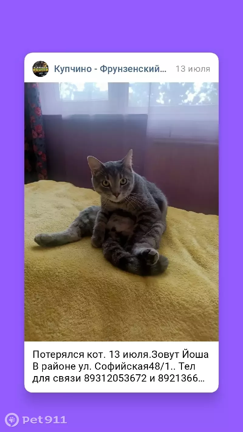 Дворовый. Мальчик кастрированный. Серый полосатый, пугливый, кончик хвоста не ровный. Откликается на имя Йоша. Упал с 4 этажа, следов крови не обнаружено, искали в округе и в подвале дома. Расклеили объявления