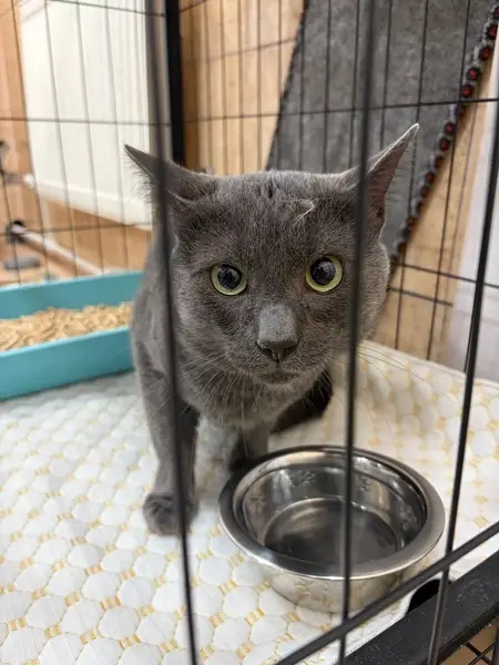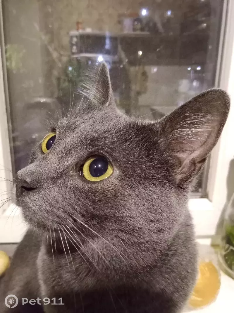 Окрас серый, глаза желто-зеленые. Зовут Кузя. 1.5 года. Ласковый, но боязливый.