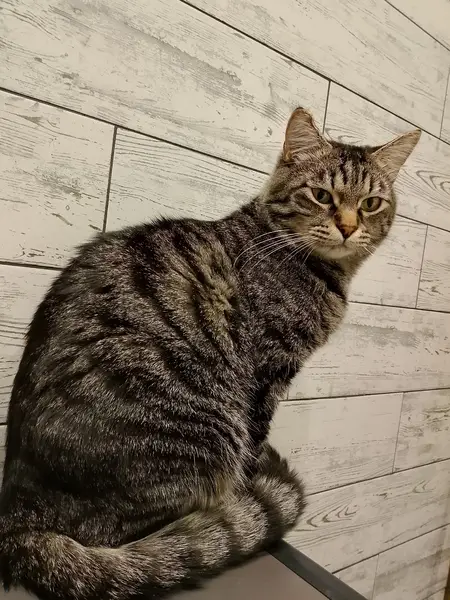 Кот Жорик,метис,крупный по размеру,выбрит живот и лапа (после ветеринара),очень пугливый,глаза выпучены
