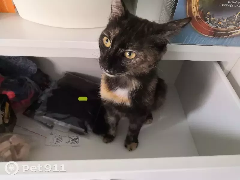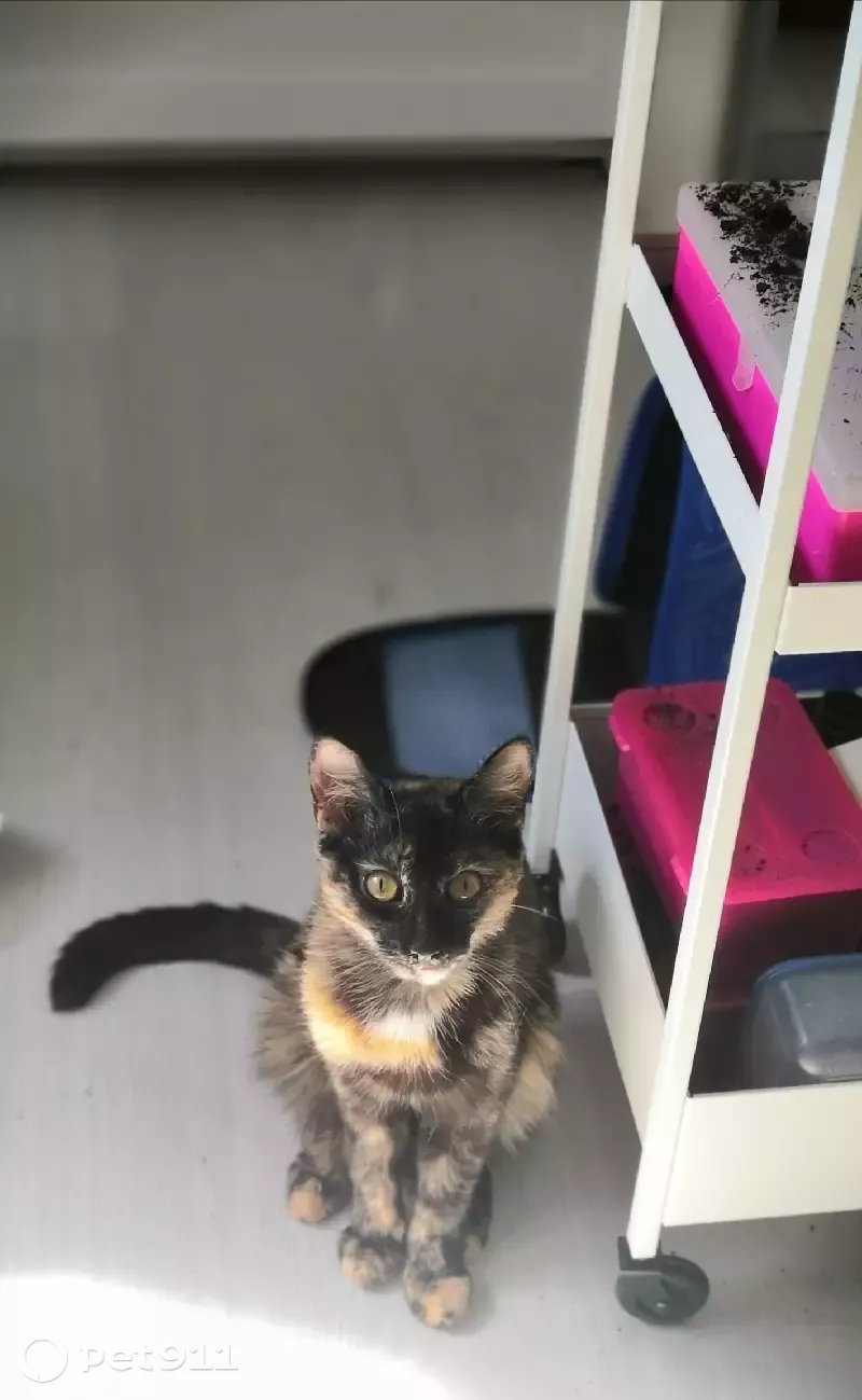 Кошке 1 год. Упала с балкона и убежала. У неё черепаховый окрас со светлыми пятнами на груди и голове. Носит красный ошейник с колокольчиком. Не ручная, отзывается на Джинни.