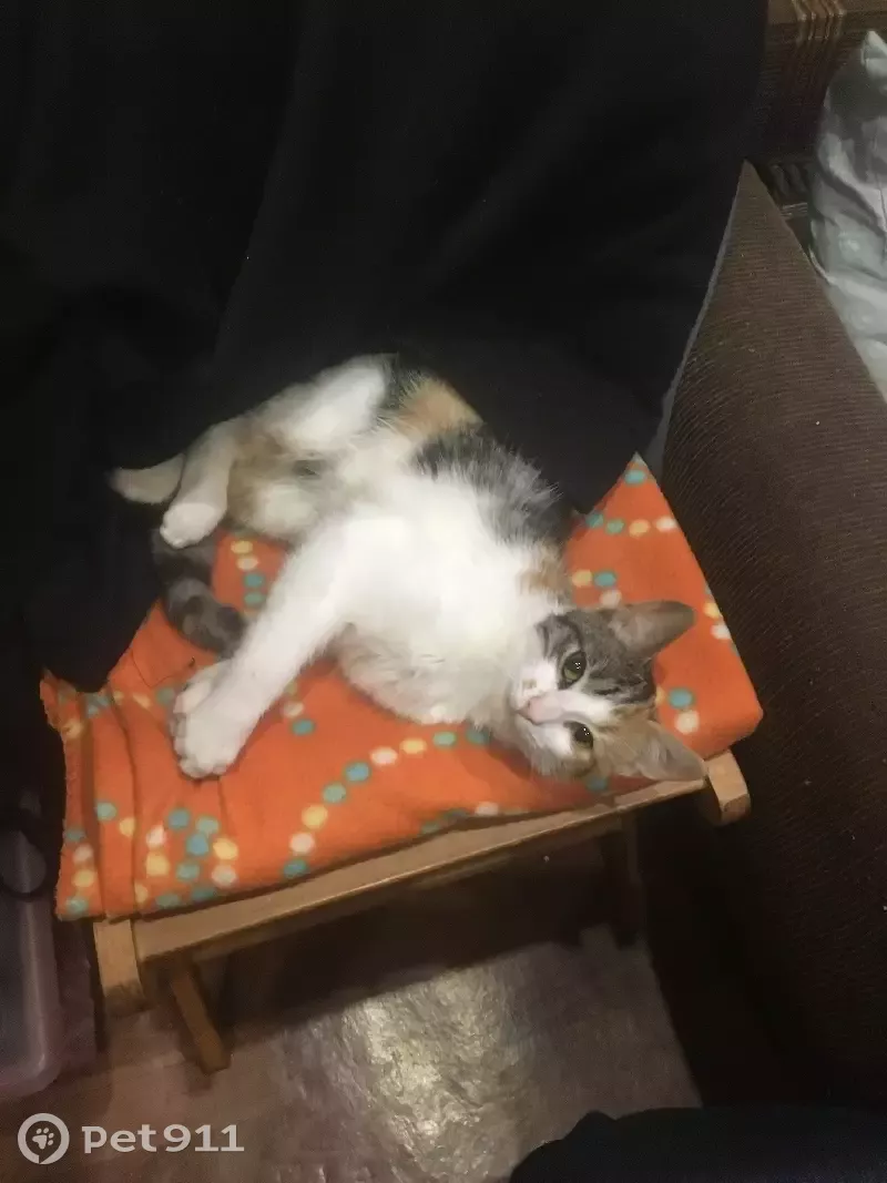 без породы, окрас белый с чёрно-серыми и рыжими пятнами(одна сторона мордочки рыжая, другая - черно-серая). Кличка - Пик, но может не отозваться, может выйти на звук сухого корма или при виде красной точки от лазерной указки. Незаметно выбежала из двери квартиры