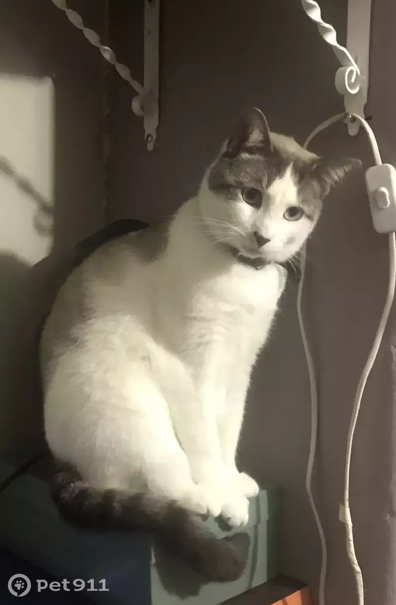 Кот 4,5 года. Белый с темной спинкой и темным хвостом. Глаза грязно-голубые. Имя — Имбирь. Кастрирован. Чипирован. На шее был чёрный ошейник. Кот добрый, домашний, на улицу не ходил. Пропал в Невском районе. Но, возможно, был вывезен в центральный район и там где-то выпущен. Очень надеюсь, что мой котик найдётся.
