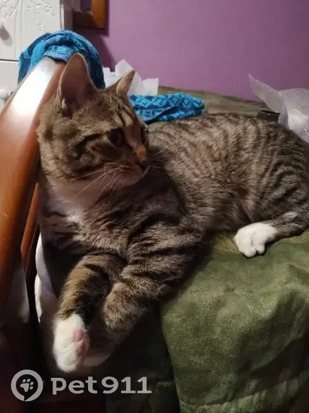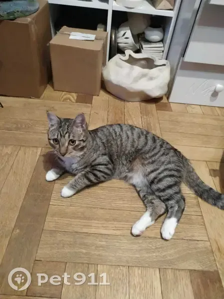 Самец, 8 месяцев, кастрирован, окрас полосатый, 4 лапки белые, грудка белая. Выбежал в парадную и затем во двор. Без ошейника. Когда пугается глаза круглые и большие
