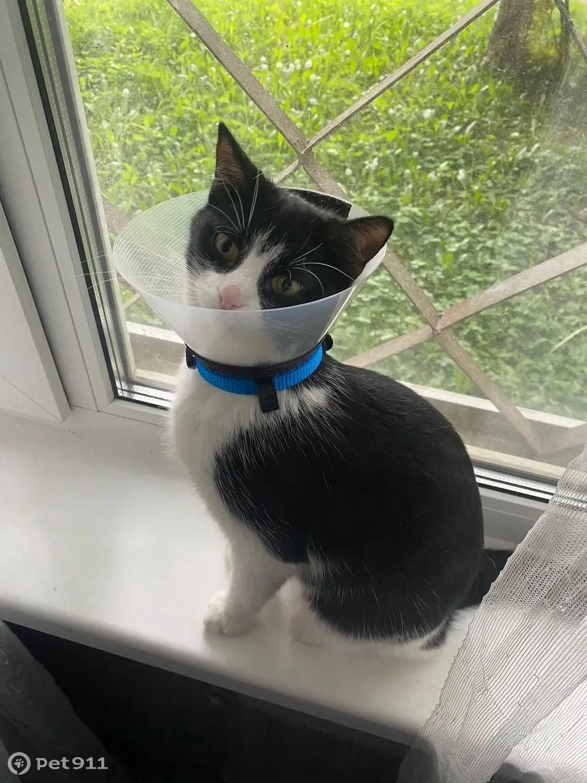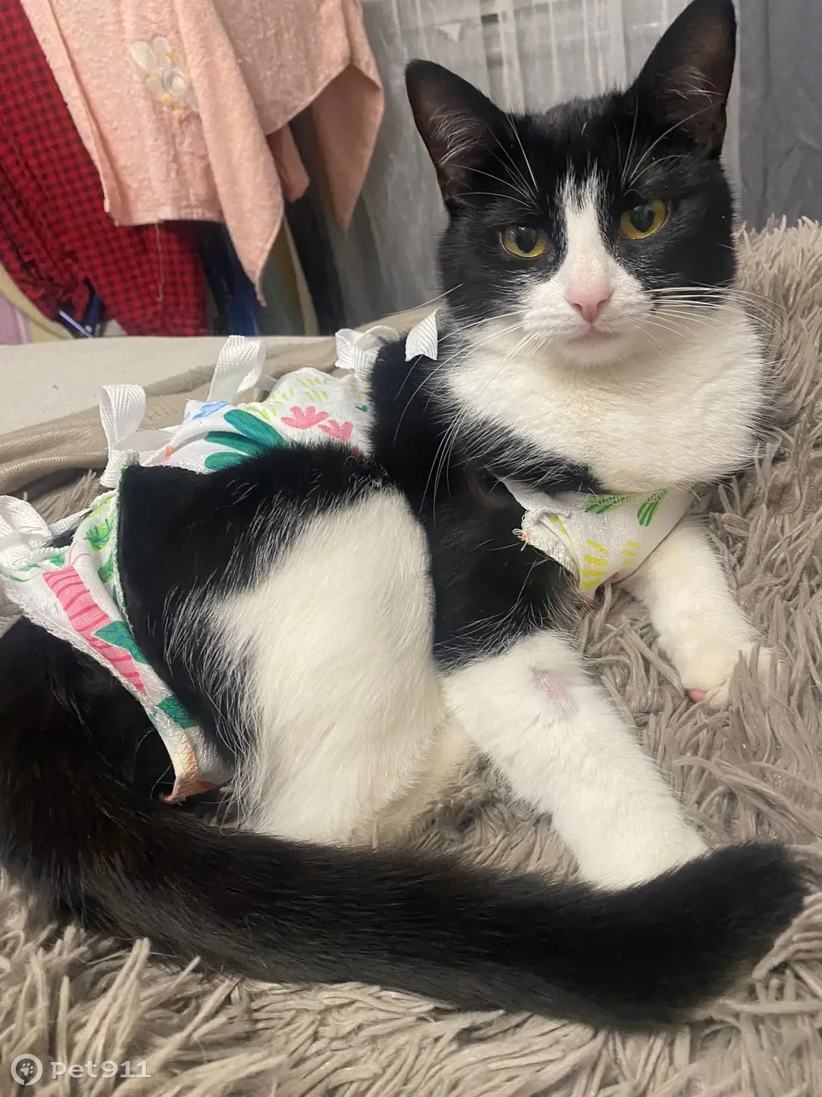 Кошка домашняя, ей меньше годика. Пузико выбрито, недавно была операция.