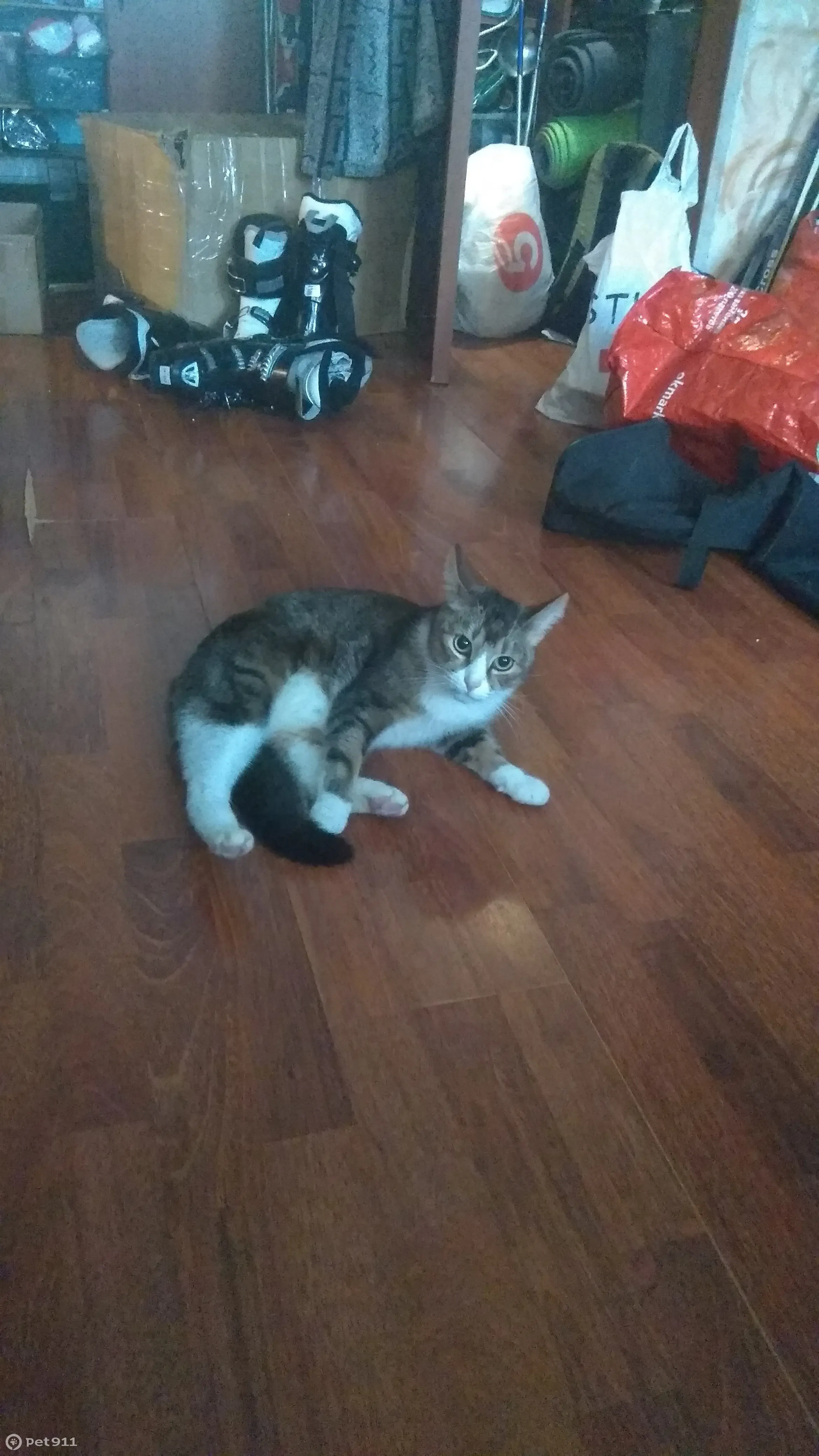 Кот, 5 лет. Метис, коричневый с рыжиной, мордочка, грудка, живот и лапки белые. Окрас морды - симметричный. На лапках белые носочки, на задних - до колена, на передних только низ лапок. Кастрирован. Сбежал на улицу через открытую дверь, не успели поймать.