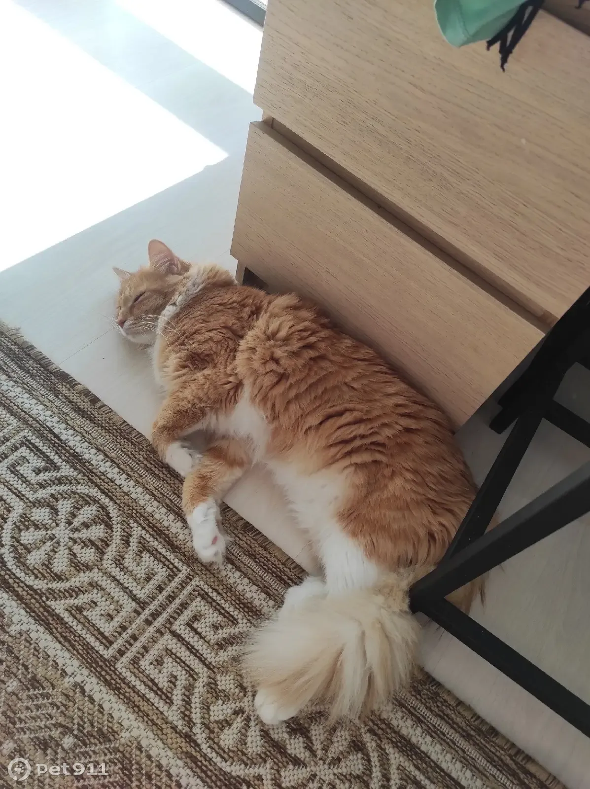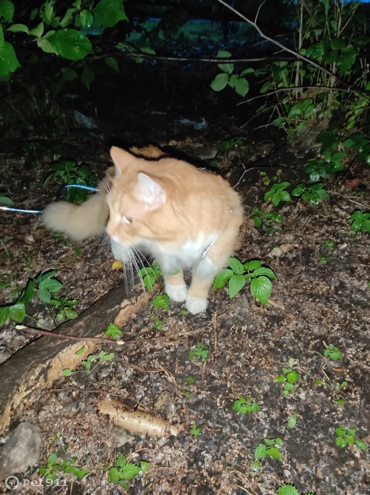 Мальчик по кличке Дюша, рыжего цвета, со шлекей и поводком с отражателями света как показано на фото, большой кот с очень пушистым хвостом смахивает на Майкуна ,но он просто крупный