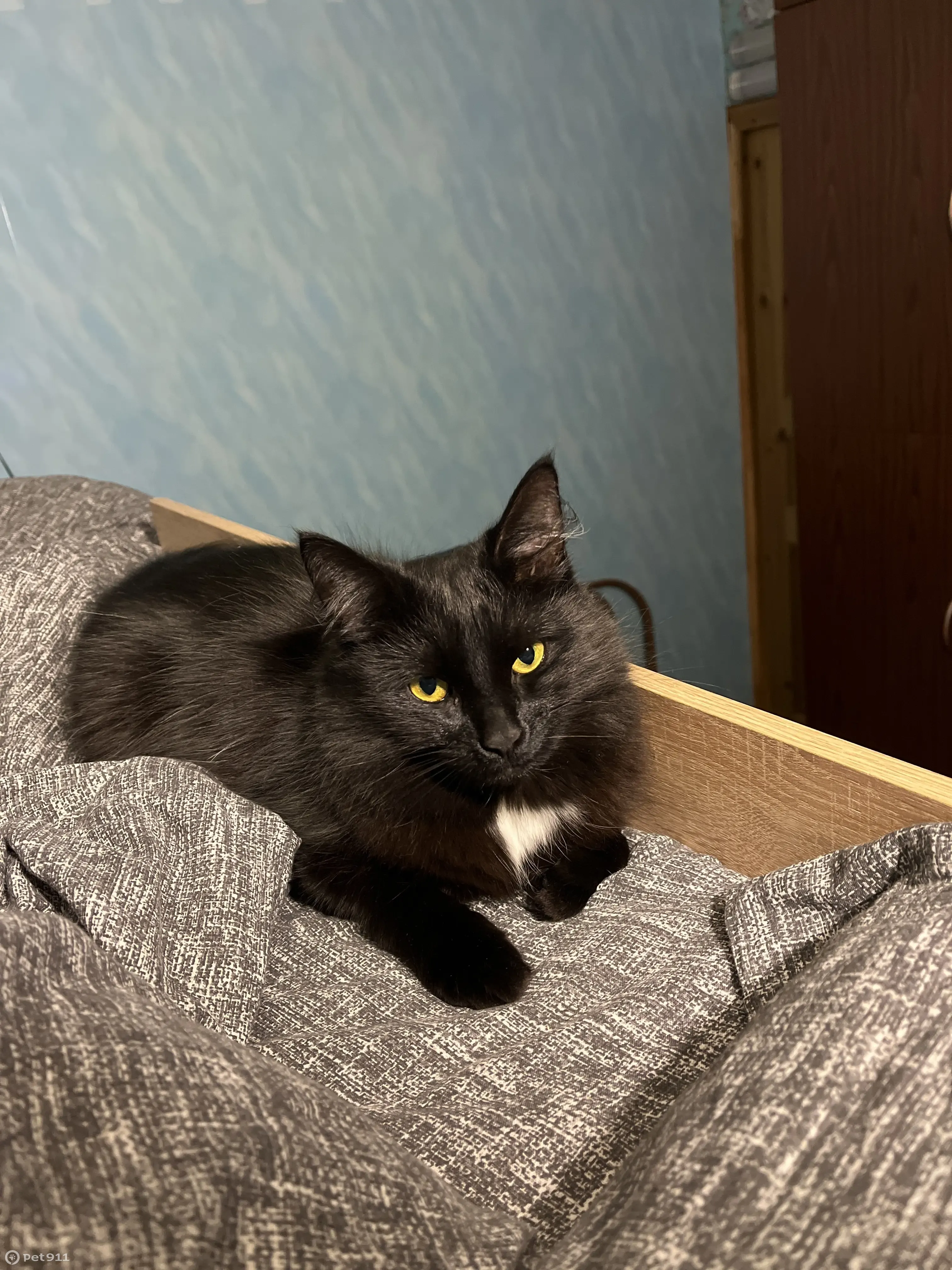 метро Кировский завод, Автово, улица Новостроек. Потерялся кот по имени Люцик, черный кот с белым пятнышком на груди, в зеленом ошейнике. Котик крупный, пушистый.