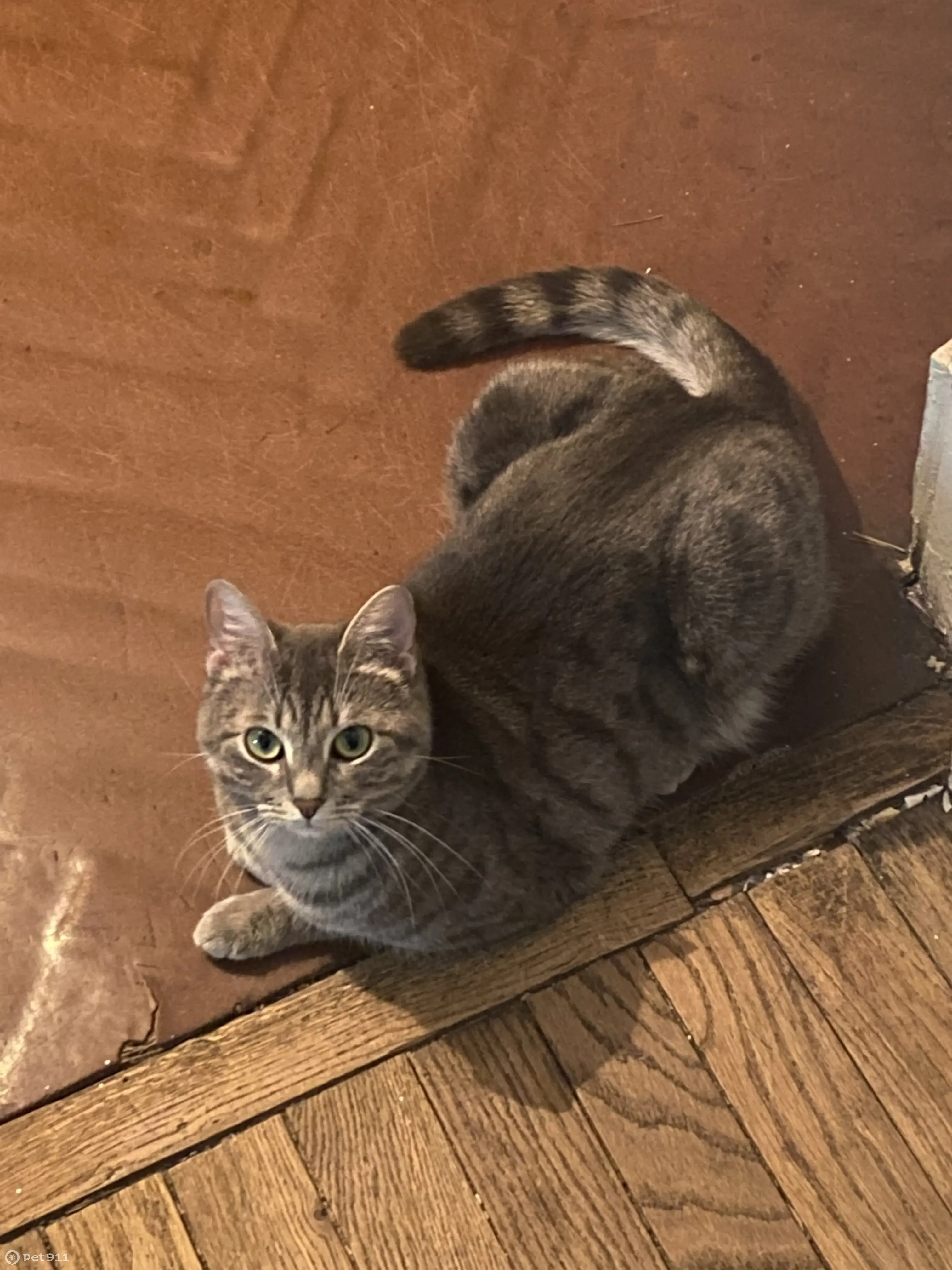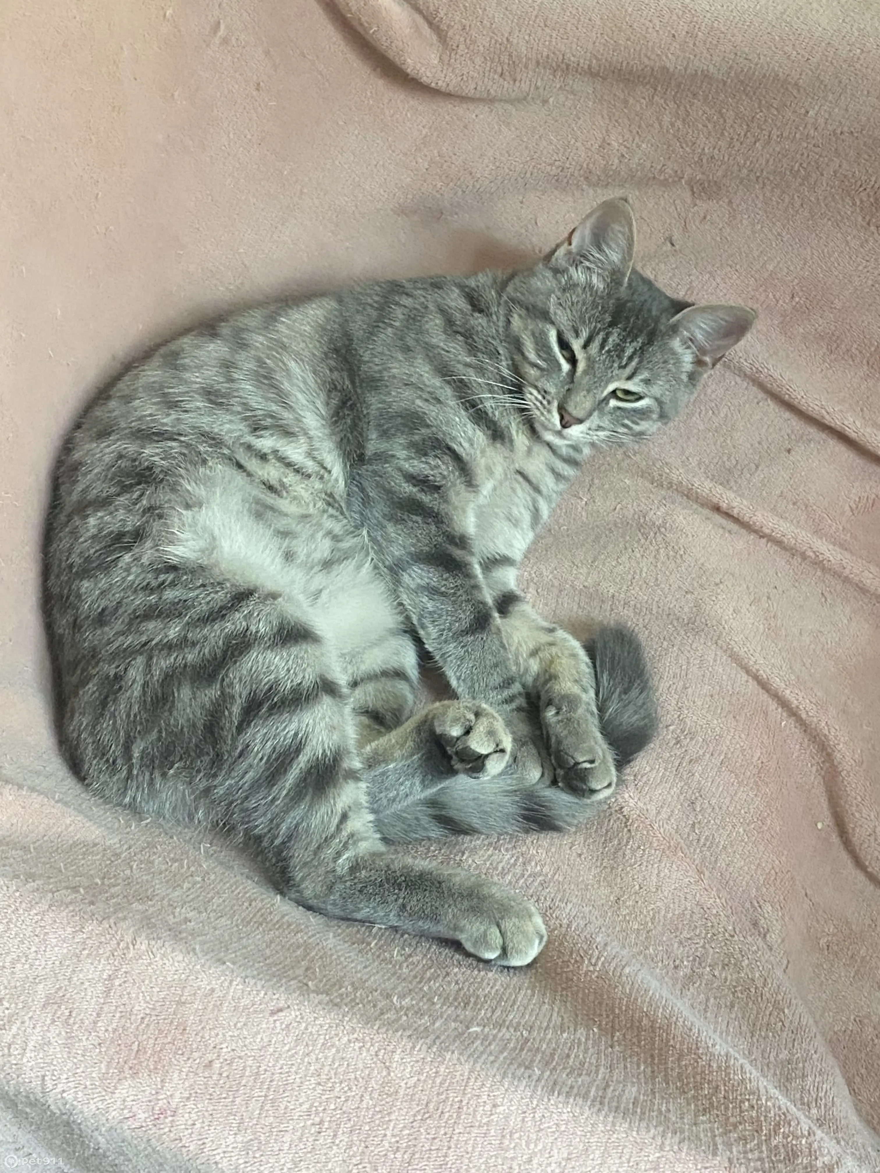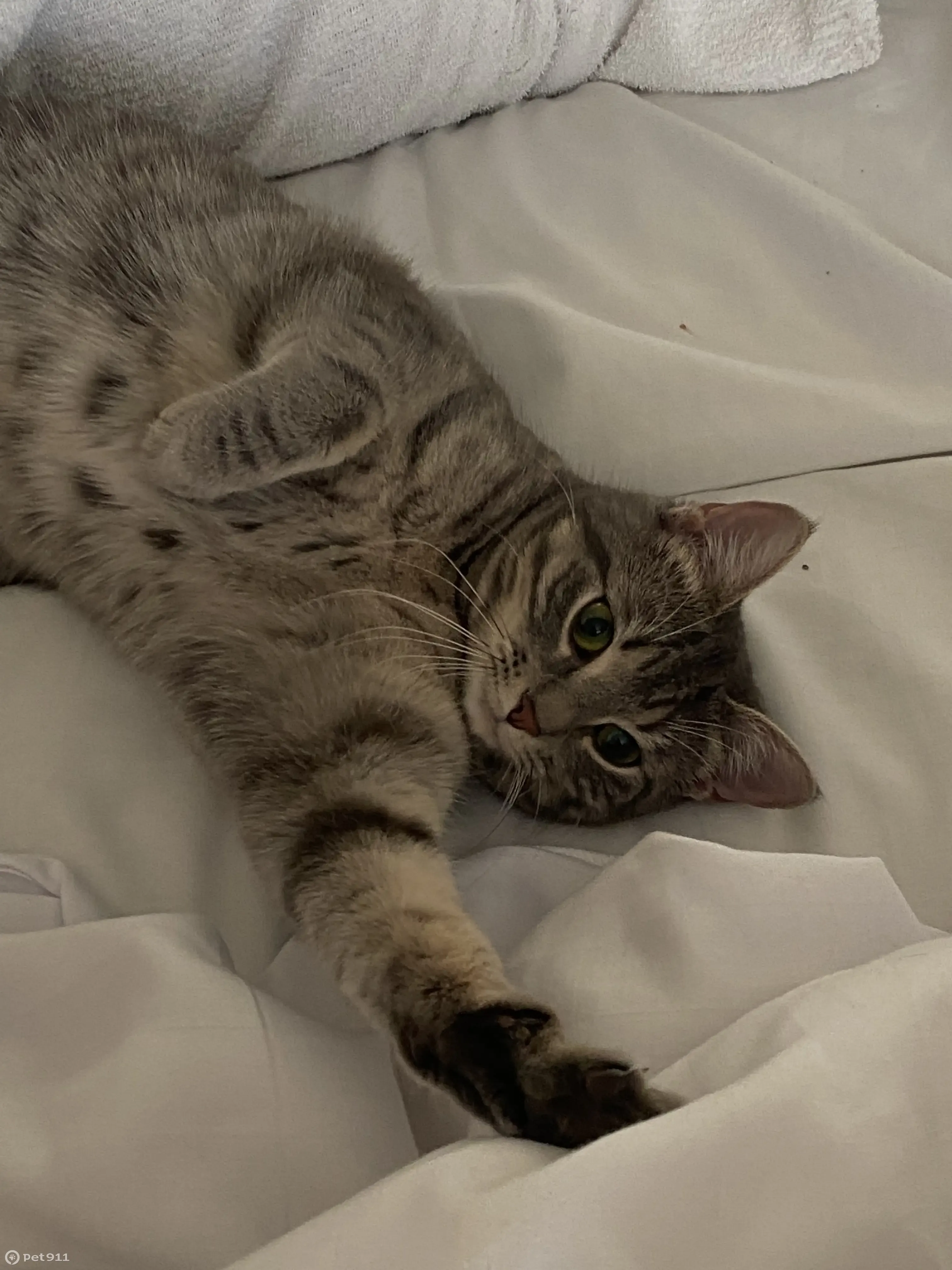 Светло-серого окраса и в темно-серую полоску, живот светлого цвета, глаза зеленые, лапы длинные, шерсть короткая и очень мягкая. Ей всего 3 года. Откликается на кличку Пандора.