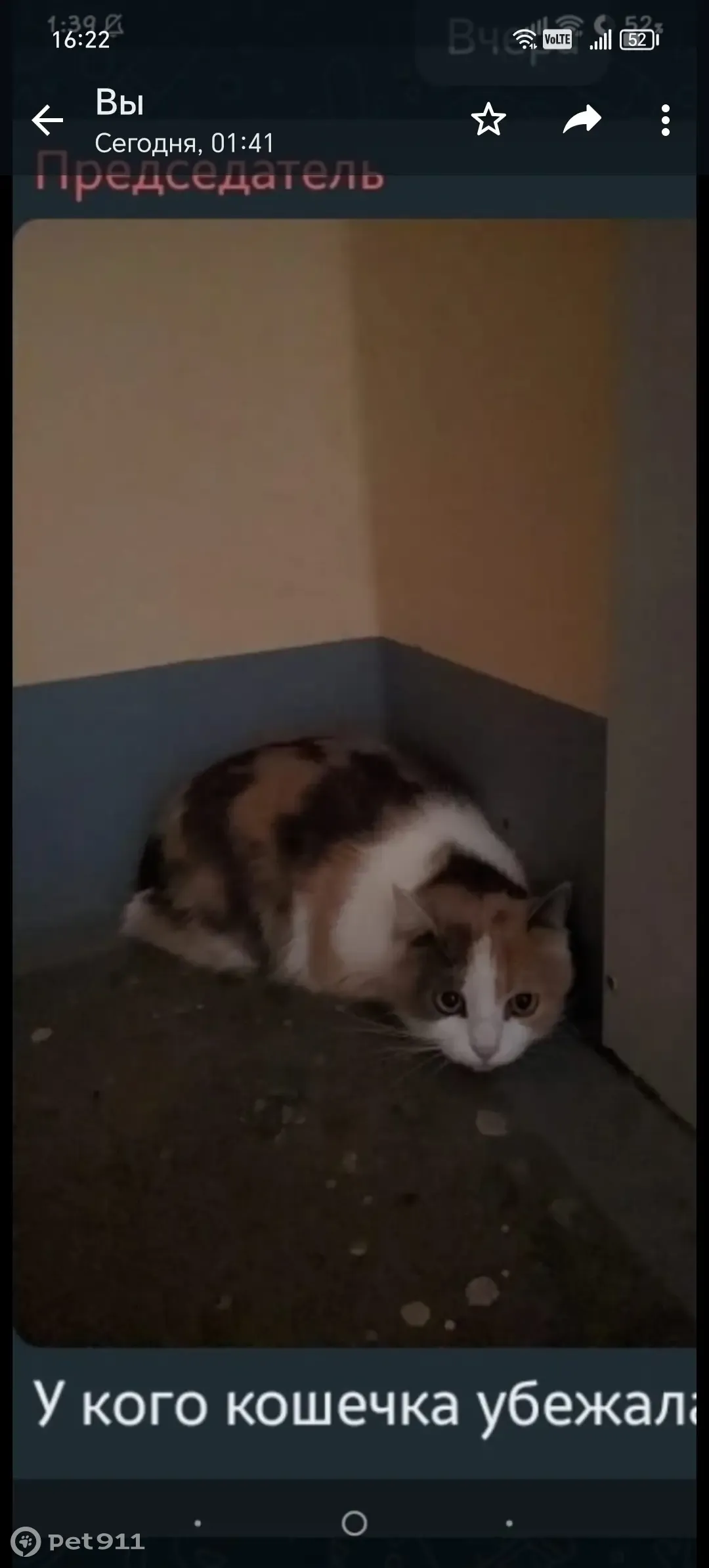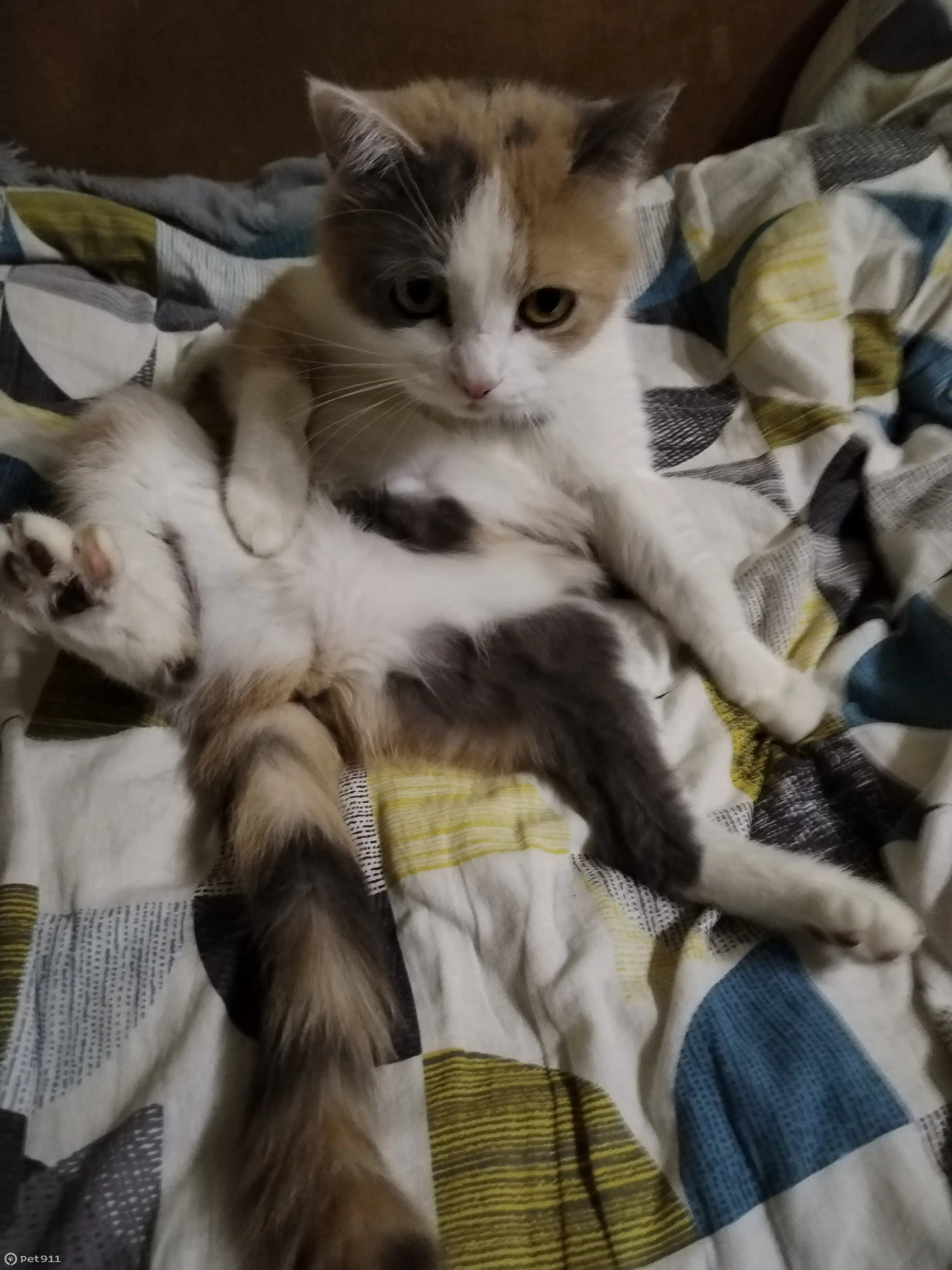 Трёхцветная кошечка, с жёлтыми глазами, не худая, плотного телосложения ,всего боится ,домашняя,окрас бело-рыже серый, ласковая ,но может от испуга царапнуть, выбежала в дверь, сидела в парадной, когда обнаружили её уже нет, большая просьба кто увидит сообщить.