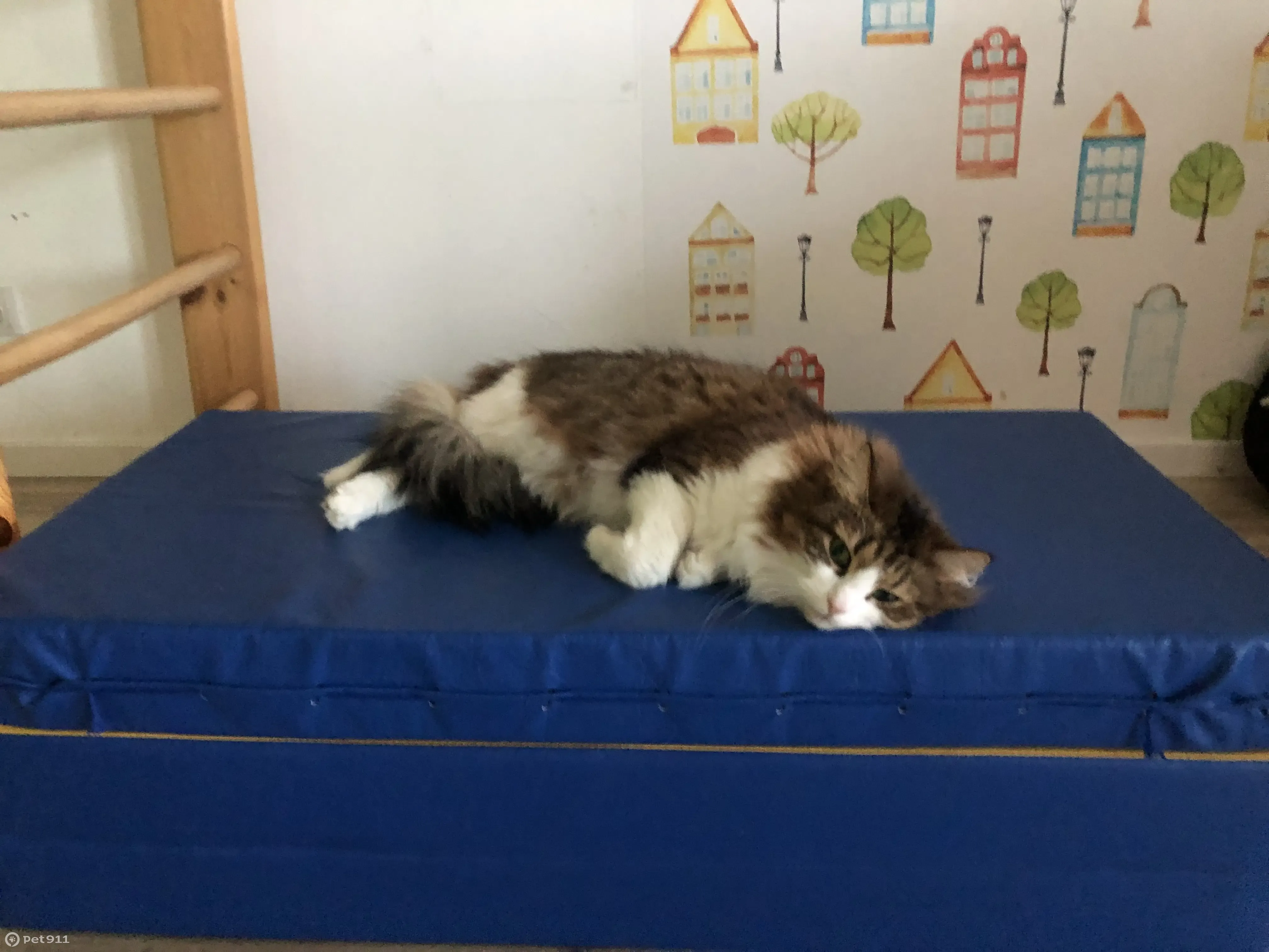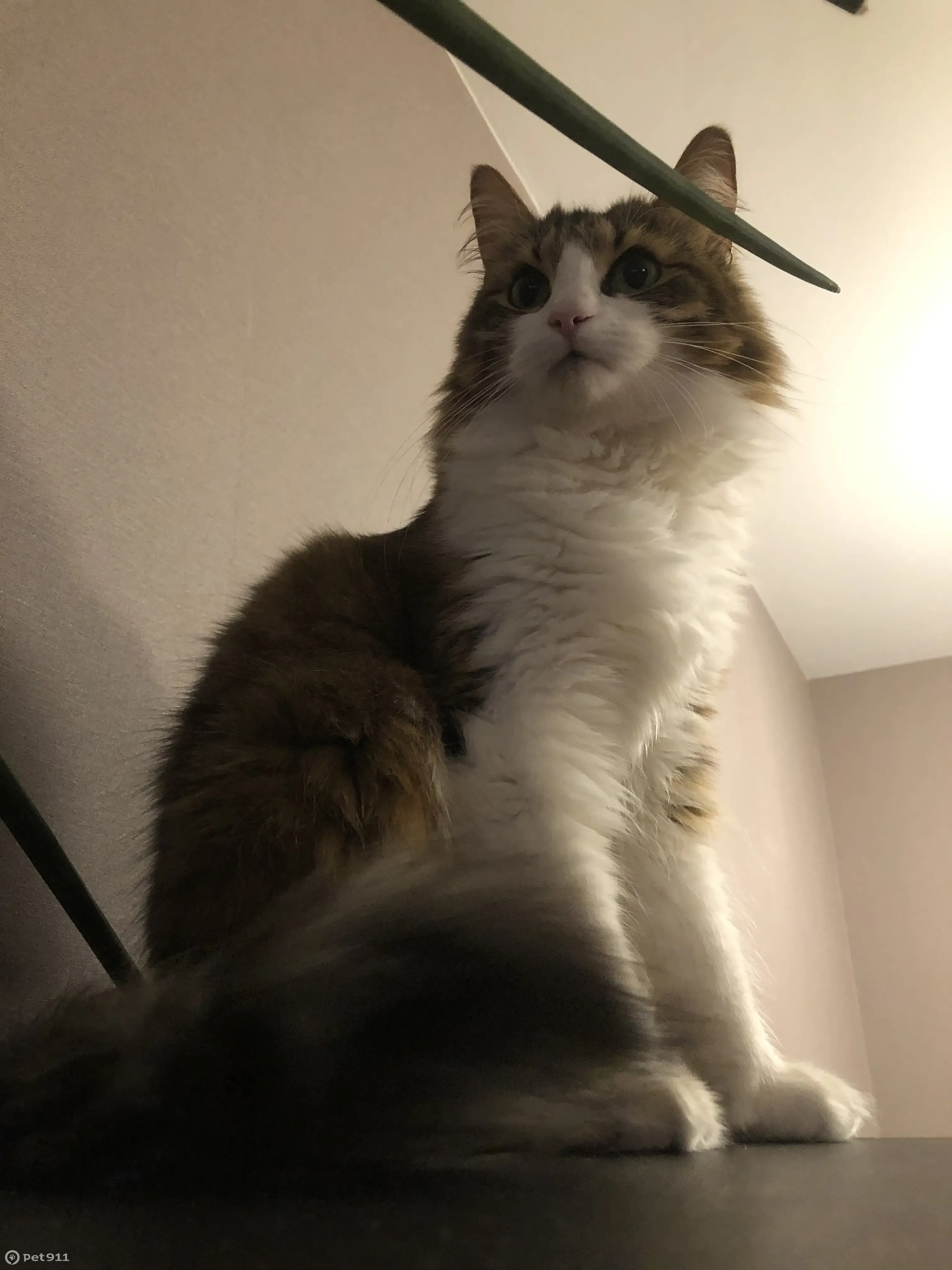 Домашняя кошка с зелеными глазами, белой грудкой и белыми лапками, хвост пушистый. Случайно выскочила из домашней двери на лестницу подъезда, после чего скорее всего оказалась на улице (видимо кто-то из жильцов дома выпустил ее через две двери подъезда)