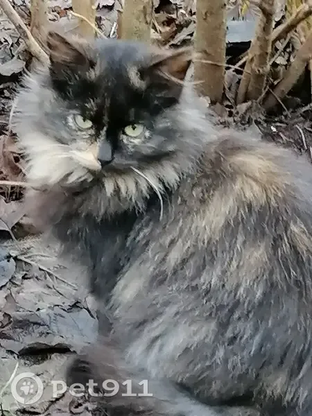 Кошка 3 года, пушистая темный окрас с рыжими пятнами, мяукать не может.