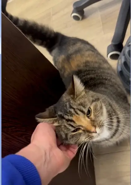 Полосатая кошка. Черные подушечки лапок. Пятнистый животик.