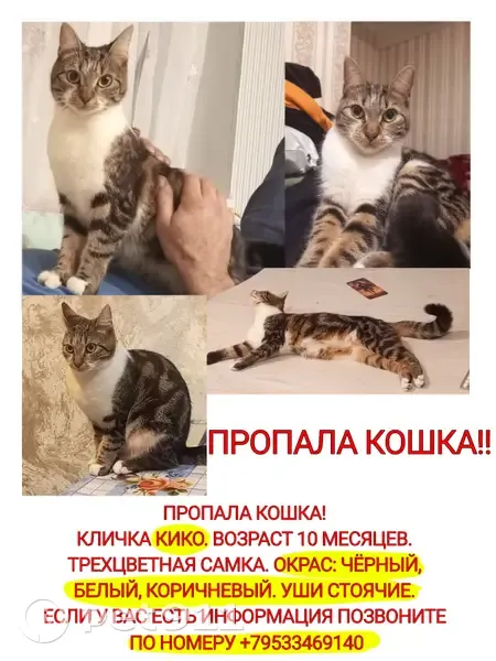 Пропала кошка. Трехцветная, черепаховая. Цвета: Чёрный, Рыжий, белый, коричневый. Ушки стоячие, носик красный, глаза зелёные. Зовут Кико, отзывается на Кико и кискис. Возраст 10 месяцев. Маленькая, очень пугливая и любопытная. СПб ИСКРОВСКИЙ ПР ДОМ 10 МАКСИМАЛЬНВЙ РЕПОСТНОМЕР ТЕЛЕФОНА ВЛАДЕЛЕЦА +79533469140. ЛЮБАЯ ИНФОРМАЦИЯ БУДЕТ ПОЛЕЗНА!!