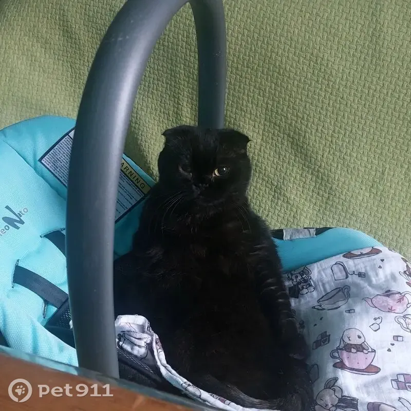 Потерялась кошка. 28.02.2025 около 16.00 выпрыгнула из коляски и убежала (она залазит в корзину внизу коляски и спит там). Вероятнее всего, находится где-то в Ладожском парке или окрестностях!!! Кошка породистая – шотландская вислоухая, черного цвета.
