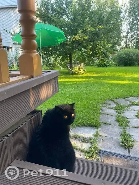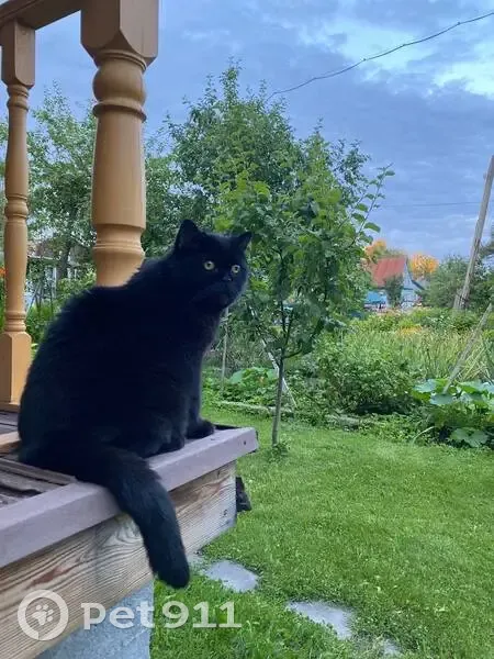 Выбежал из квартиры, пугливый, нетактильный, любит прятаться. Черный , на спинке есть слегка седые участки шерсти, глаза янтарные, такого будет сложно спутать