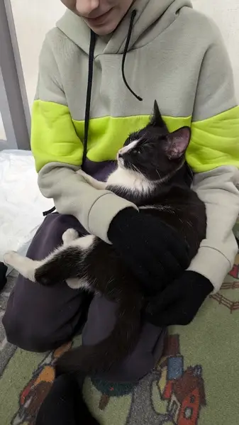 Черно-белый с белым треугольником на морде, кастрирован. На подушечках лапок черные "сердечки".