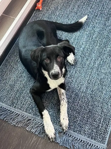 Порода метис русской гончий. Окрас черный с белыми пятнами, была в красном ошейнике. Дружелюбная, но иногда пугливая, любит бегать за кошками и голубями. Сорвалась с поводка во время прогулки.