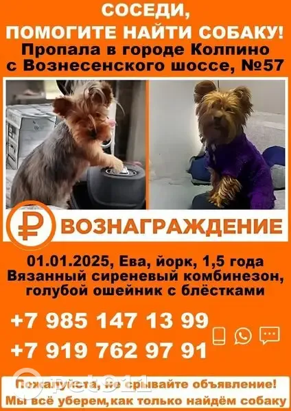 темная сталь с подпалом,убежала испугавшись и бесследно пропала 01.01.25 г в Колпино,от дома по Вознесенскому ш 57с3,была одета в вязанный сиреневый комбинезон,ошейник голубой с блестками! ЛЮДИ!Если У ВАШИХ СОСЕДЕЙ,ДРУЗЕЙ,ЗНАКОМЫХ,появилась собачка Йорк -девочка в этом году ,после нового года, присмотритесь пожалуйста,может быть у них моя Ева! Увидете похожую на мою собачку сделайте фото,при возможности видео и сбросьте мне в личку, или сообщите по т 89851471399. Анонимность и кондефициальность гарантирую!