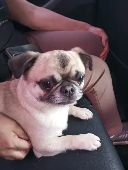 Очень похожа на мопса по окрасу, только повыше, чем мопс. Морда удлинённое, хвост крючком. Очень ласковая, но боязливая собака. Утром выгуливали и пропала. Бетти уже 13 лет.