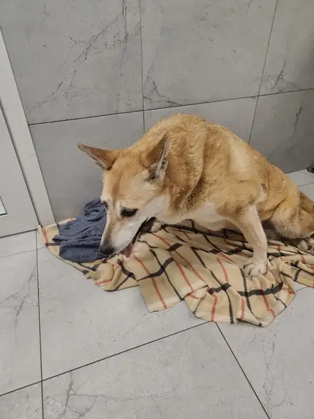 Окрас рыжий, с темной мордой, одно ухо висячее, на хвосте темные пятна.