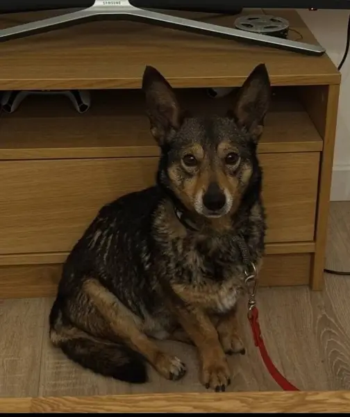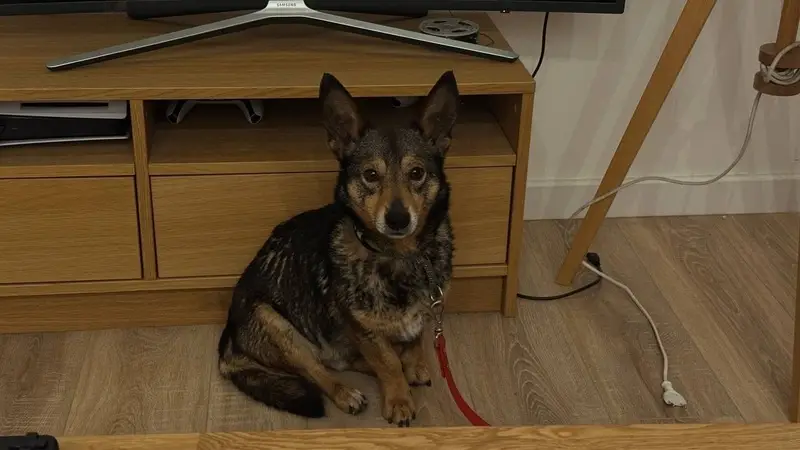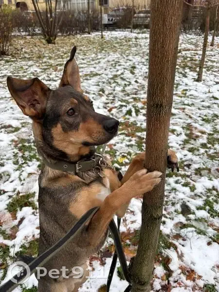Во время салюта собака испугалась , дернула поводок и отломался карабин на ошейнике. Собака в наморднике и желто-сером комбинезоне. Собака дружелюбная. Но пугливая. Приютская. На ошейнике номер телефона.