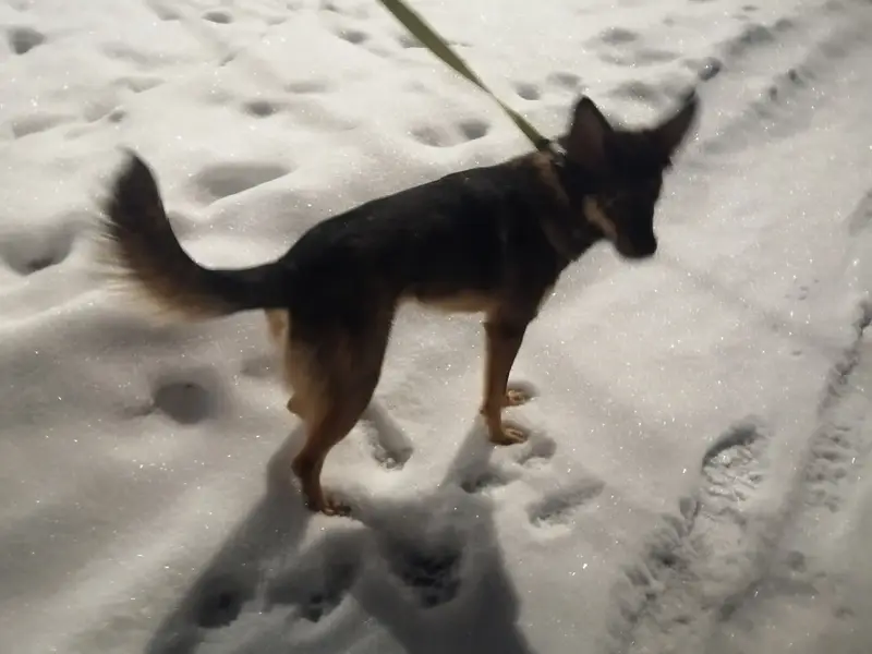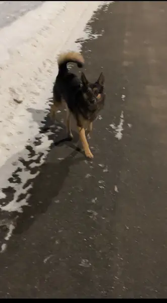 Коротко пострижен, ошейник с номером телефона на собаке, при радости виляет задом