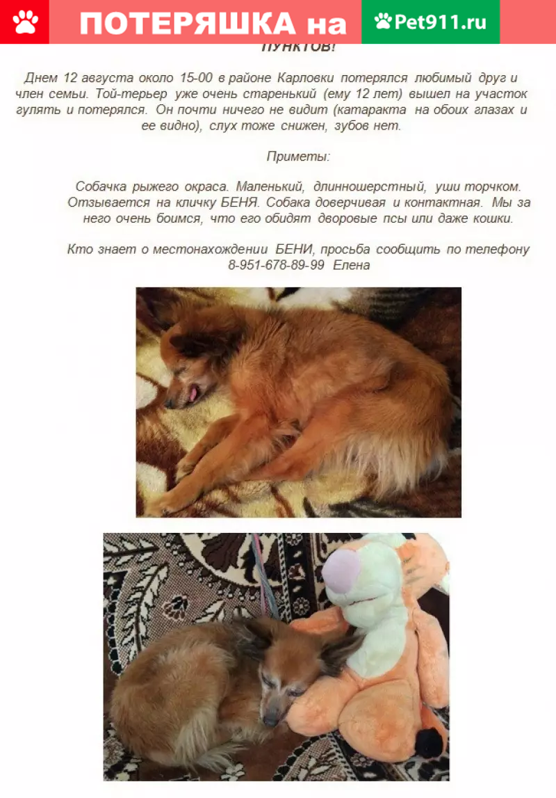 ЛО - Кировский район - Назия https://vk.com/shapeof Пропал длинношерстный той терьер мальчик рыжего окраса в районе Назии (Ленинградская область), точнее Карловка. 12 августа около 15-00, 13 августа в 7 утра его видели местные жители, он слепой, катаракта обоих глаз, зубов нет, ему 12 лет,с сединой, слух тоже снижен. Елена #пропала_собака #потерялась_собака #окрас_рыжий #морда_седая #инвалид #той_терьер #мальчик #метис