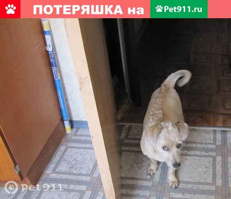 Собака, похожа на терьера , возраст 6 лет, маленький, 30 см в холке, окрас бежевый с черными кончиками шерсть, уши висят. Остался обросший хохолок по всей спине после стрижки.