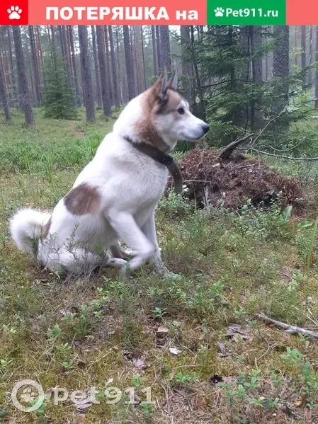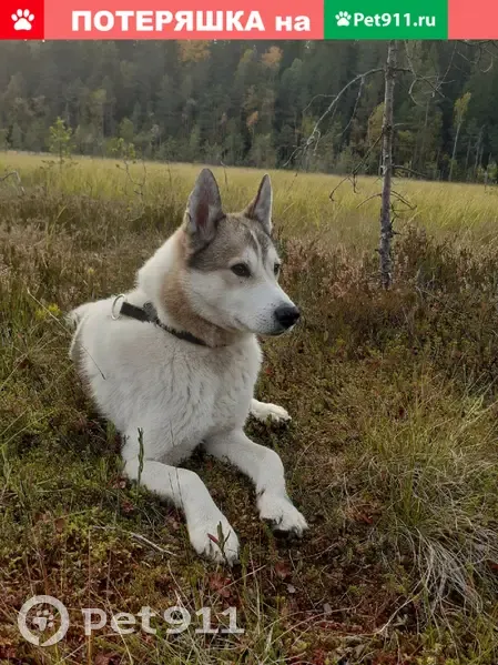 В Выборгском районе Ленинградской области, в районе оз. Зеркальное. Кобель западно- сибирской лайки, возраст 10 лет, кличка: Хоффман, Хофа. Ушёл с прогулки и не вернулся. Салютов не боится, мог уйти общаться с людьми и угощаться праздничными шашлыками приехавших в лес и на дачи отдыхающих, либо за пустующей сукой. Очень общительный и абсолютно не агрессивный к человеку. Окрас белый с палевой маской и пятнами, очень умный. Шд
