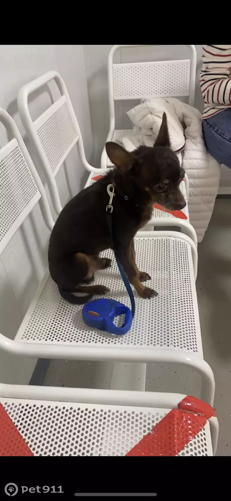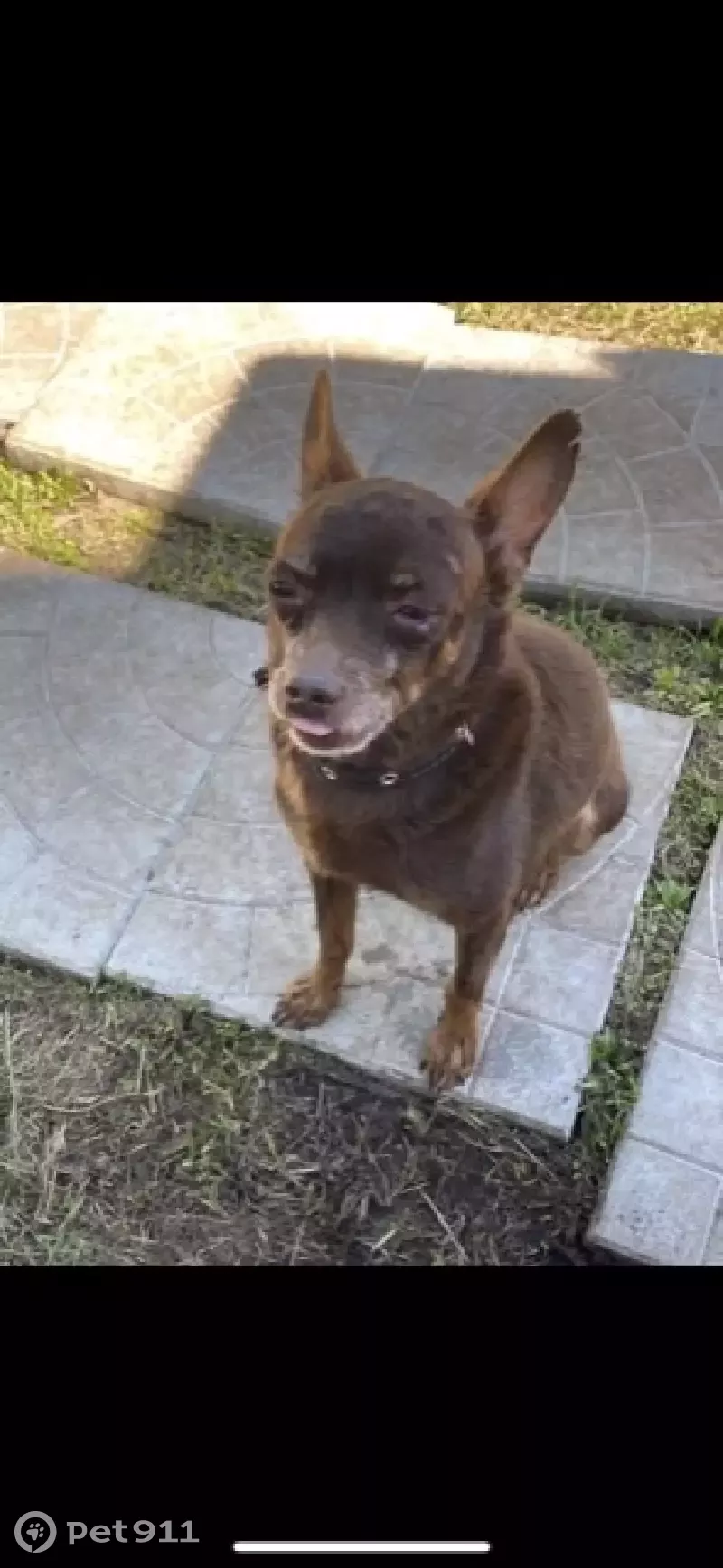 Той Терьер, коричневого окраса. Чёрный ошейник. Немного порвано левое ушко. 13 лет, мордочка седая.