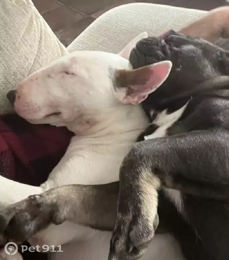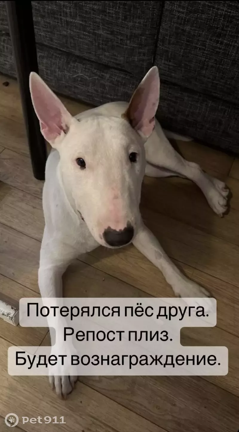 Мини бультерьер, кабель, белый с коричневыми пятнышками на ухе, чипованный 900217000171047. Ещё маленький, есть второй пёс начал бегать и беляш рванул по марсовому полю, после видели его что кто-то нёс на руках и увёл.