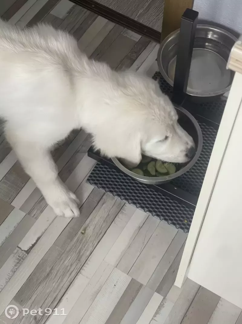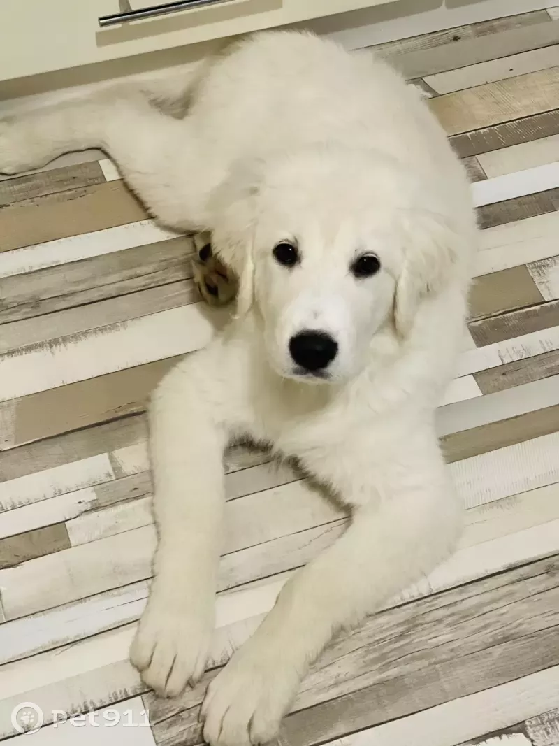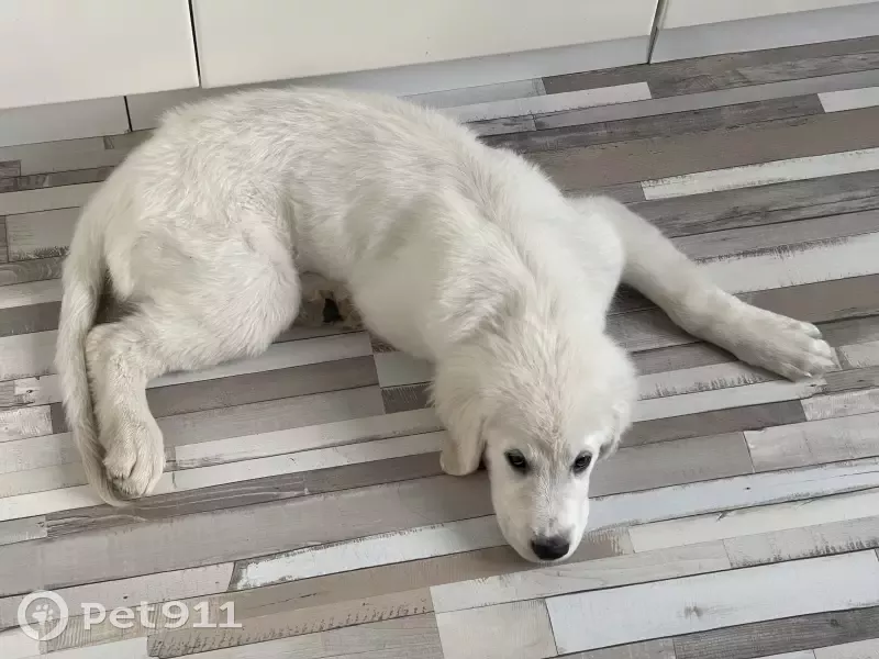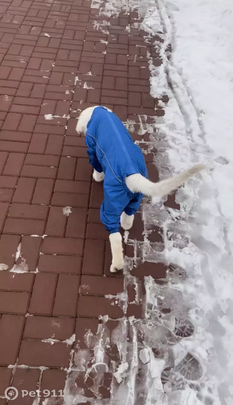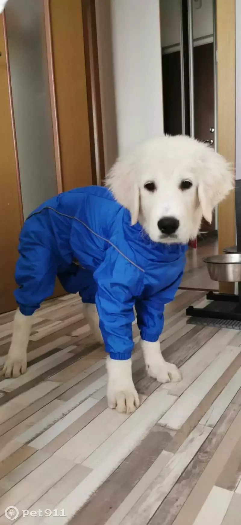 Щенок белый 4-5 месяцев в синем комбинезоне с ошейником.