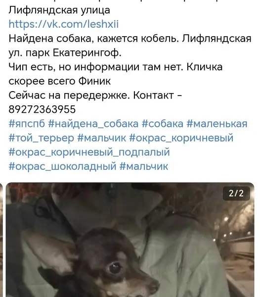 🆘 потерялась Той терьер девочка. Особые приметы: Темный окрас (коричнево подпалый) возраст 2.5 года. Очень маленького размера. Был надет зелёный ошейник светоотражающий. Хвост не купирован. Чипирована. Стерилизована, но шрам еле заметен, боязлива и недоверчива к незнакомым . Проблемы со здоровьем. Произошла авария Санкт-Петербург на Волхонском шоссе не доезжая перекрестка Киевского шоссе . Собака выбежала из машины и убежала в неизвестном направлении . Точные Координаты: N 59.749329 E 30.296112 ссылка на координаты https://yandex.ru/navi/?whatshere%5Bpoint%5D=30.296112%2C59.749329&whatshere%5Bzoom%5D=18&lang=ru&from=navi Может, кто-то видел, что у соседей появилась похожая собака, сообщите, пожалуйста, 😎 анонимность и вознаграждение 🎉 гарантируем! Важна любая информация! 🚨Сообщившему местонахождение собаки, так же гарантируется вознаграждение 🎉 и анонимность😎 Телефон: +7 911 005 6808, Наташа.