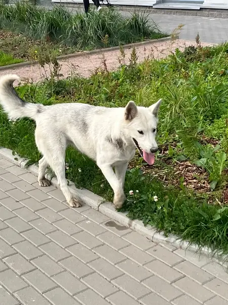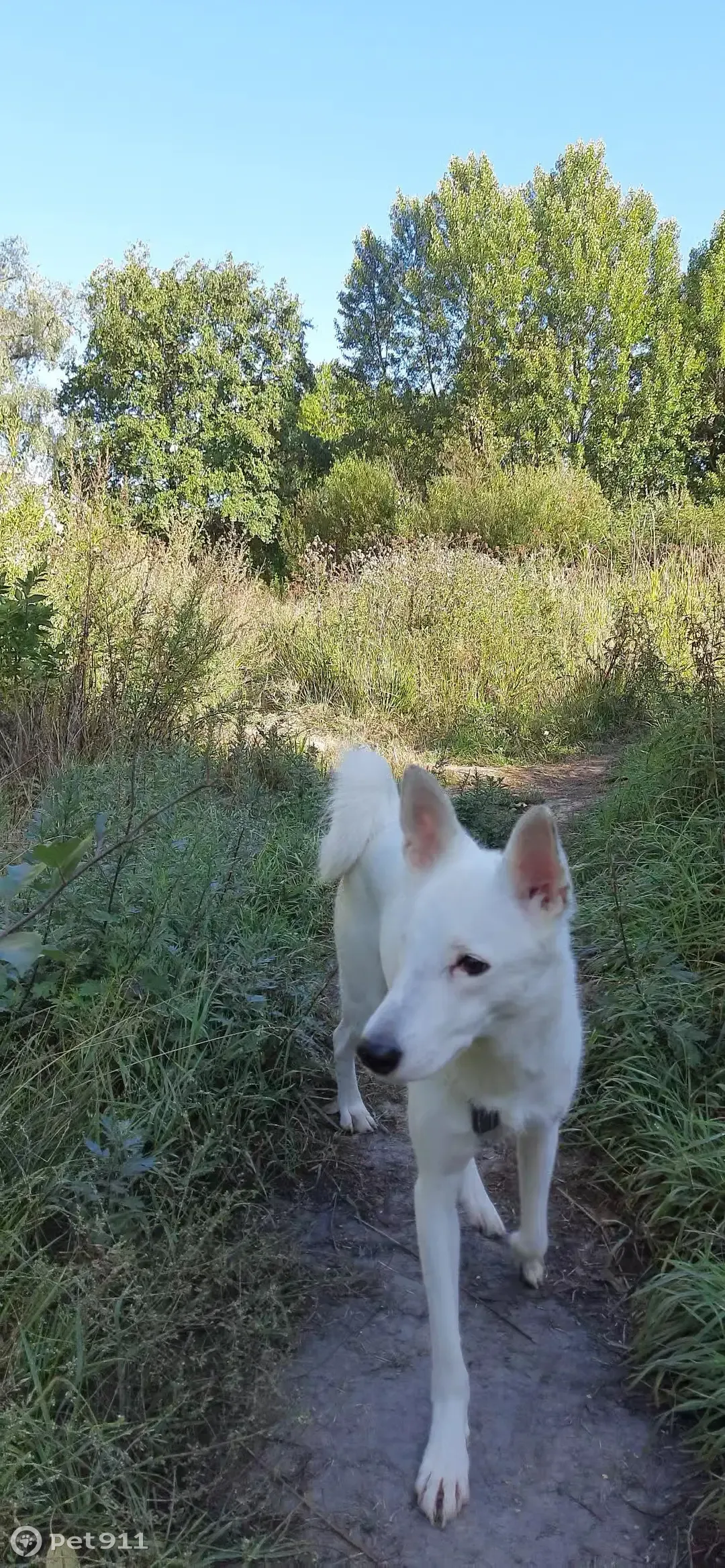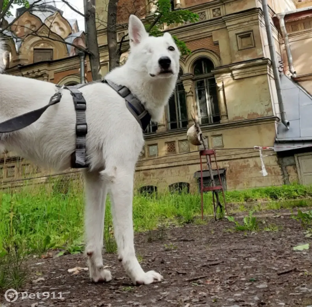 Кобель, кастрирован. Белый окрас, нет правого глаза. Открыла дверь в подъезд, в этот момент в рядомстоящую машину врезается другая, пёс запаниковал и вырвался с поводка. Адресник слетел в тот же момент.