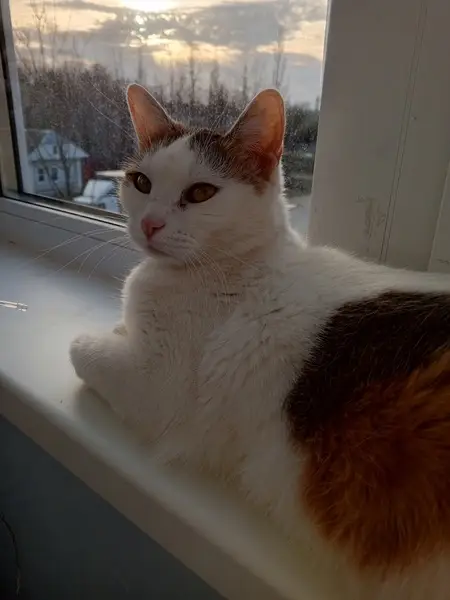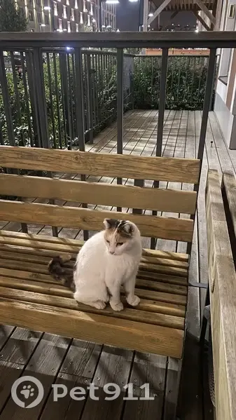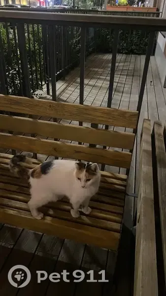 Трёхцветная. Вроде бы кошка, очень ласковая и рук не боится. Кусочек уха потеряла(