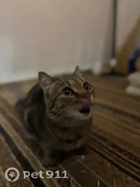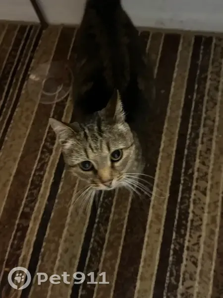 Найдена кошка , девочка Коричнева в полоску, спина мраморная Ласковая На шее ошейник от блох коричневого цвета В районе Тани Бибиной , в новых домах 1/11 Была у 3 подъезда Сразу понятно домашняя