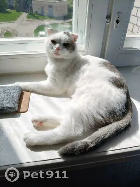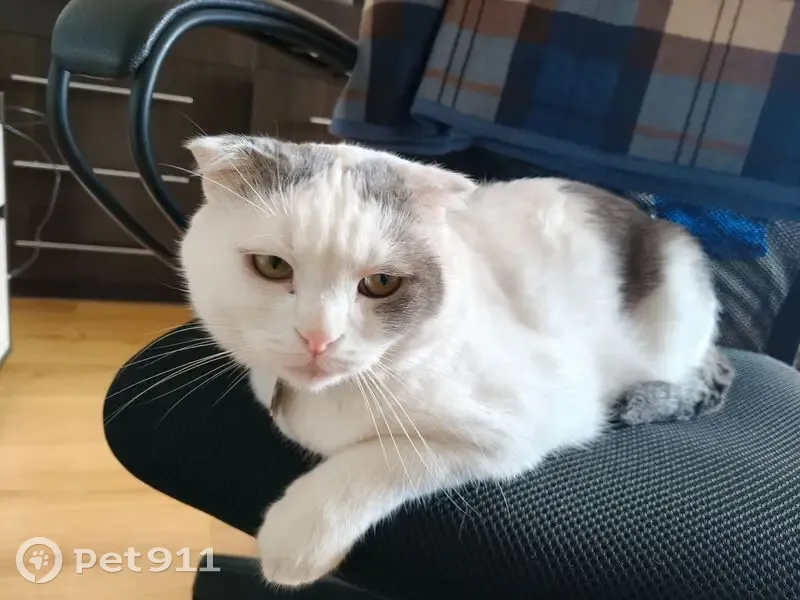 Белый с серыми пятнами (на мордочке и от середины спины весь хвост серый), вислоухий, зеленые глаза На шее голубой ошейник с адресником: кличка и номер телефона на обороте В районе 5-6 утра 4.11 выскочил в окно 2 этажа
