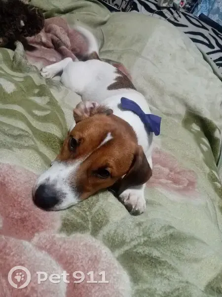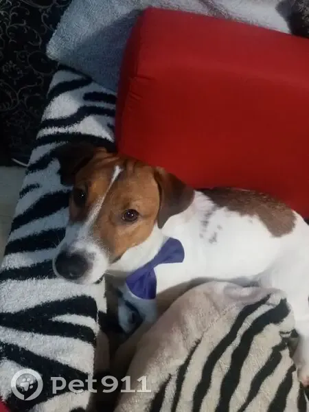 Джек рассел терьер(белый с оранжевыми пятнами, на голове сердечко) , одета шлейка оранжевая и ошейник черный с шипами. Убежал из гаража и пропал, помогите