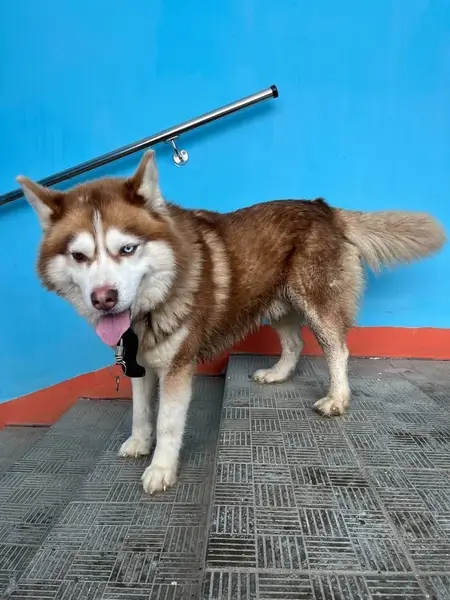Шоколадный хаски,с карими глазами,добрый, доверчивый пес.Доверили знакомому человеку,который бросил идущего за ним пса и уехал. Собака с ошейником и 5м поводком....