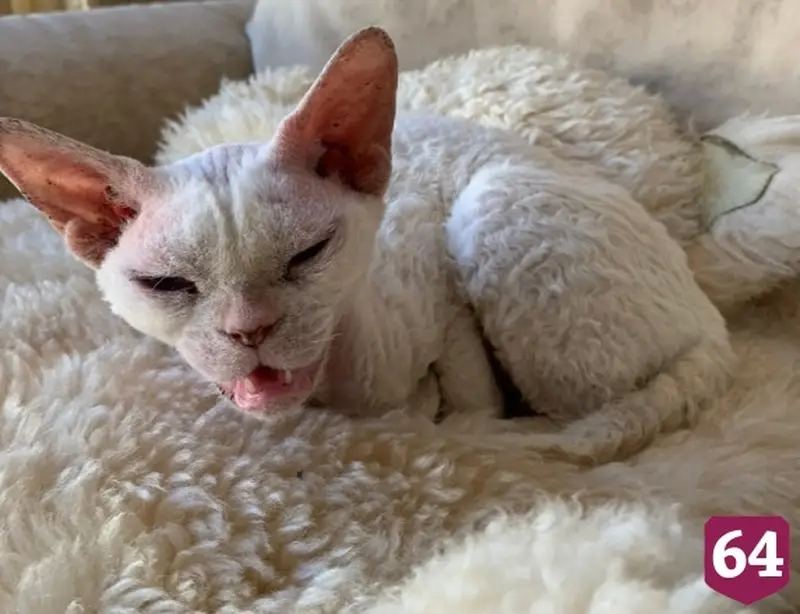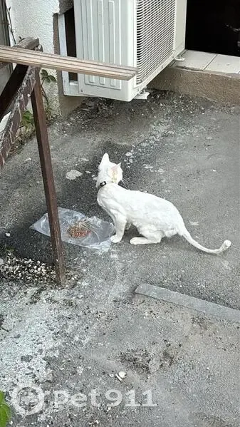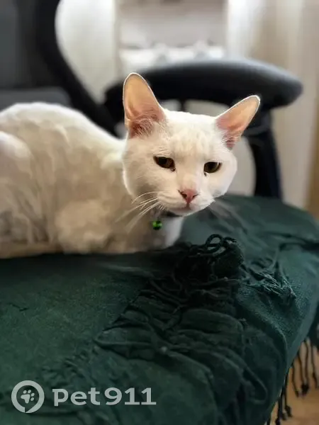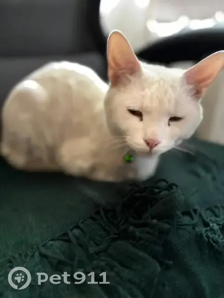 Белая кошка, стриженная, с маленькой кисточкой на хвосте, с грустным выражением на мордочке. Надет серый ошейник с зелёным шариком, под хвостом следы зелёнки.