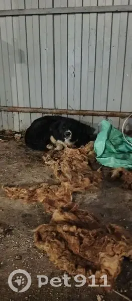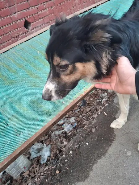 Оранжевый ошейник, черная шерсть, белая грудь и мордочка, не было видно, но вроде и лапки белые, как гольфики. Видно, что собака домашняя, не агрессивная
